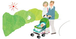 お散歩は赤ちゃんの五感を刺激し、適度な疲れで夜にぐっすり眠れるという効果も。午前中の過ごしやすい時間に、15〜30分ほどを目安に出かけて。また、室内ではおもちゃを使ったり、スキンシップをとってたくさん遊んであげましょう。