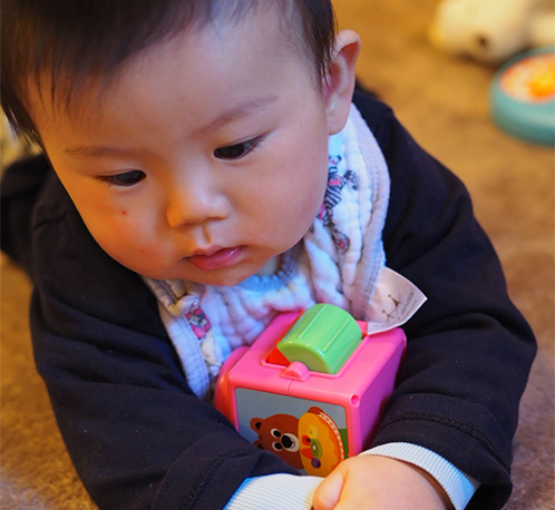 おすわりが安定してくるので両手を使って遊べるように。物をつかんだり、転がしたりすることを楽しみましょう。