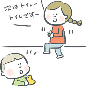遊びに夢中だったり気が向かないと、いくら誘っても「トイレ、イヤ!」。そんなときは、「ガタンゴトーン、ガタンゴトーン、次はトイレ、次はトイレでーす」と、電車ごっこで誘って楽しくトイレへ。いろいろな生活シーンに遊び心を加えて、親子で楽しみましょう。