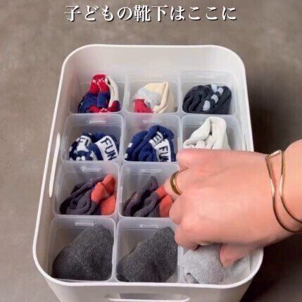 みとさんは、ニトリの「ソフトNインボックス」とセリアの「くつした整理カップ」を組み合わせて靴下を収納しています。1足ずつ仕切れるので見やすく、子どもでも選びやすいのが魅力。サッと取り出せるので毎朝の着替えもスムーズになりそうですね!