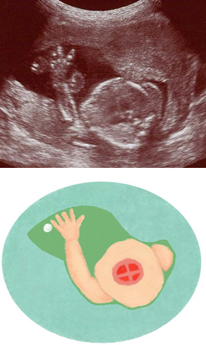 胴体の断面から心臓を見た際に、赤ちゃんの手が動いて写り込んだもの。心臓は4つの部屋に分かれています。心臓など臓器が成熟し、また、手足の動きは滑らかになってきます。