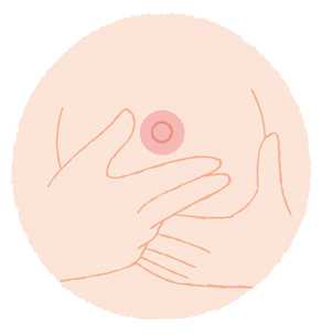 陥没・扁平(へんぺい)乳首のケアは妊娠36週以降のおなかの張りがない場合に行います。親指・人さし指・中指で乳輪部を含んだ範囲をゆっくりつまみ出すように乳頭を突き出させます。手の甲を乳頭側に倒し、人さし指と中指で乳輪部を挟んで圧をかけます。親指で乳頭の頂きを、円を描くようになでます。※自分だけで判断せず、産院や母乳外来などで相談して、指導を受けるようにしましょう。