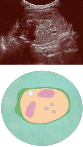 内臓のつくりがよく見えるようになります。2つの黒いだ円が腎臓。赤ちゃんが飲み込んだ羊水は、腎臓でろ過され、おしっことして羊水中に出されます。